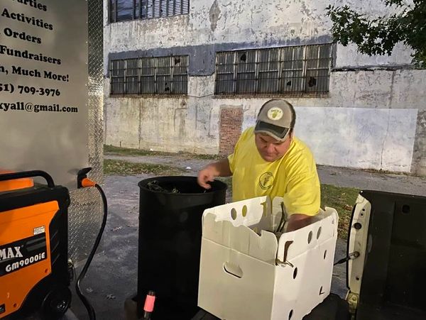 Mr. Chip "The Corn Man" Roberts feeding the corn roaster, making Shux corn Hot & Fresh right off the roaster at every event.